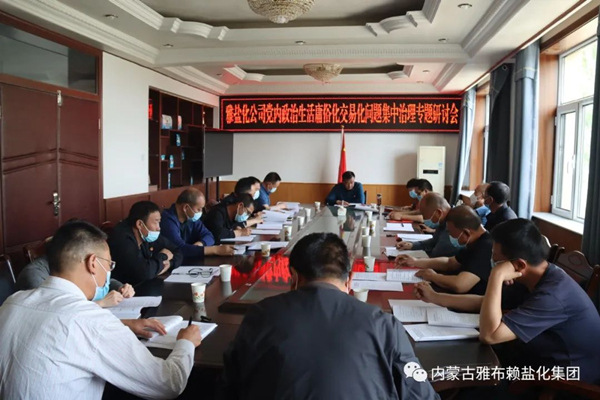 5月9日,雅盐化集团公司召开党内政治生活庸俗化交易化问题集中治理专题研讨会。公司党委书记、董事长李奎锦主持会议,集团公司党委委员、中层管理人员参加研讨会。